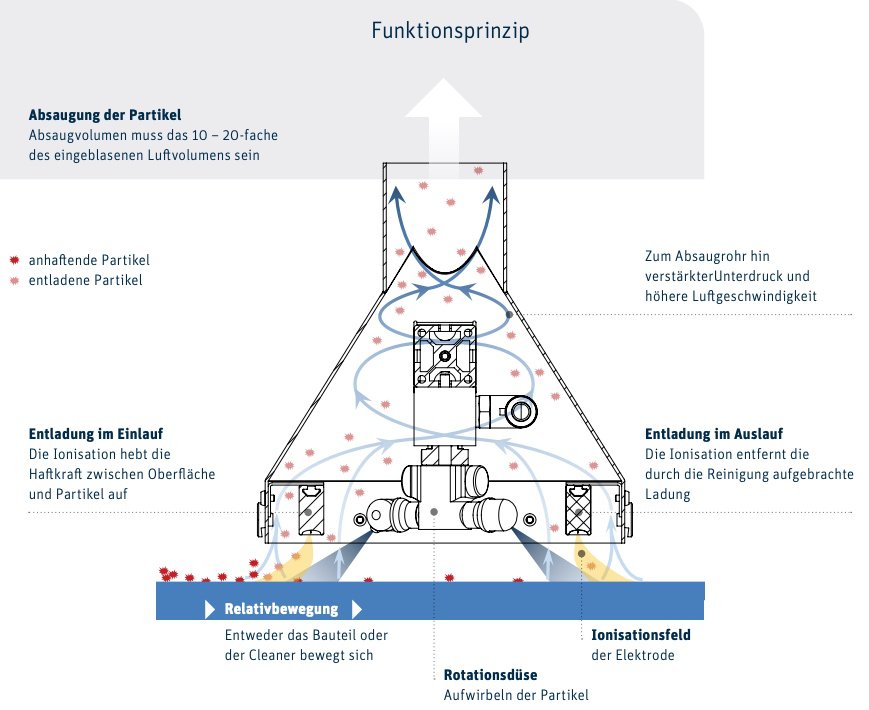 Die SCC ist die Reinigungslösung der Zukunft. Mit der Möglichkeit, Eltex-Entladekomponenten wie den POWER IONIZER, BASE IONIZER ES60 und COMPACT IONIZER ES24 anzuschließen, setzt sie vielseitige Reinigungsmöglichkeiten frei. Der Funktionsprinzip besteht aus der Partikelabsaugung und Ionisation, die Haftkraft verringert, gefolgt von der Rotationsdüse, die Partikel aufwirbelt. Diese Konstruktion gewährleistet ein optimales Ergebnis bei maximaler Sicherheit.