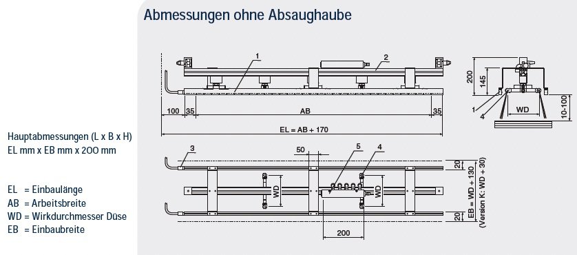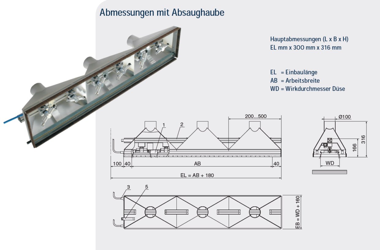 Die Abmessungen des Static Combi Cleaner SCC sind variabel, sowohl mit als auch ohne Absaughaube. Hauptabmessungen (L x B x H) sind EL mm x 300 mm x 316 mm für die Version ohne Absaughaube und EL mm x EB mm x 200 mm für die Version mit Absaughaube.
