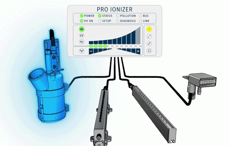 Das Gerät ist weit mehr als ein herkömmlicher Ionisierer. Als Netzgerät der neuesten Generation ist er so anpassungsfähig und leistungsstark, dass er für nahezu jede Anwendung geeignet ist. Durch das flexible VARIO-System können bis zu vier Eltex-Entladekomponenten, sei es Entladeelektroden, Ionenblasdüsen oder Reinigungssysteme, gleichzeitig angeschlossen und über separate Kanäle individuell überwacht werden.