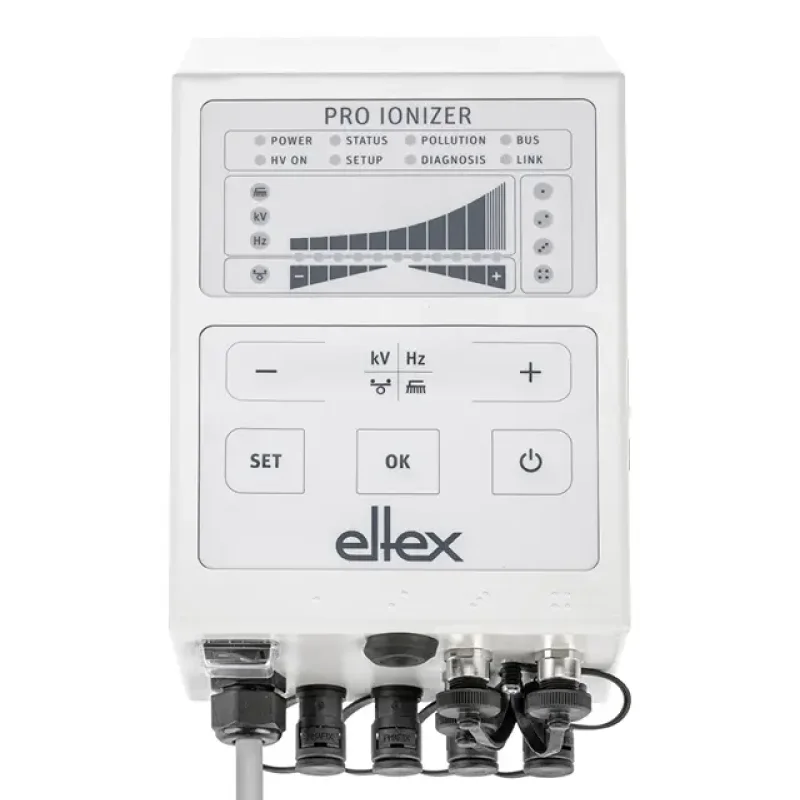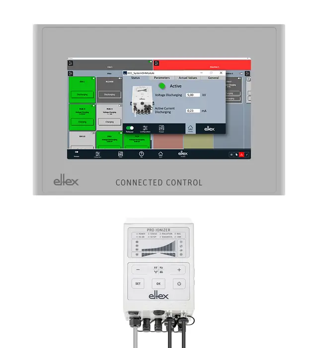 Um die Elektrostatik stets unter Kontrolle zu haben, bietet die intuitive Eltex-Steuerung die Möglichkeit, Prozessparameter wie Spannung, Frequenz und Ionenbalance individuell zu regulieren. Dies gewährleistet auch bei empfindlichen Prozessen eine stabile Ionenbalance.