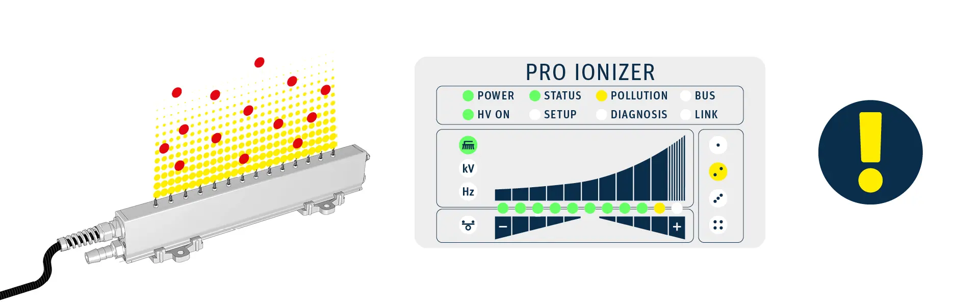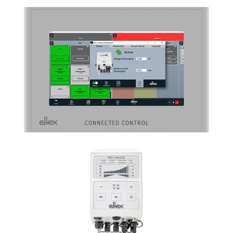 Maximale Elektrostatik-Kontrolle: Individuelle Einstellungen für Spannung, Frequenz und Ionenbalance garantieren optimale Ergebnisse in allen Produktionsumgebungen.