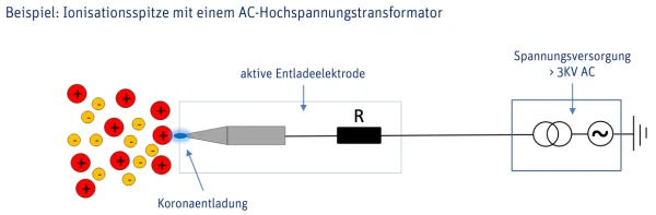 Aktive Ionisatoren sind mit Hochspannung versorgte leitfähige Spitzen ausgestattet, die in ihrer unmittelbaren Umgebung Ionen erzeugen. Dieser Prozess erfolgt durch Koronaentladung und Feldemission. Die erzeugten Ionen werden von einem elektrischen Feld, das durch eine aufgeladene Oberfläche erzeugt wurde, angezogen, wobei Ladungsträger der gegensätzlichen Polarität die statische Oberflächenelektrizität neutralisieren. Ionisatoren, die mit Wechselspannung betrieben werden, erzeugen an einer Spitze beide Polaritäten, was die Effizienz der Entladung erhöht.