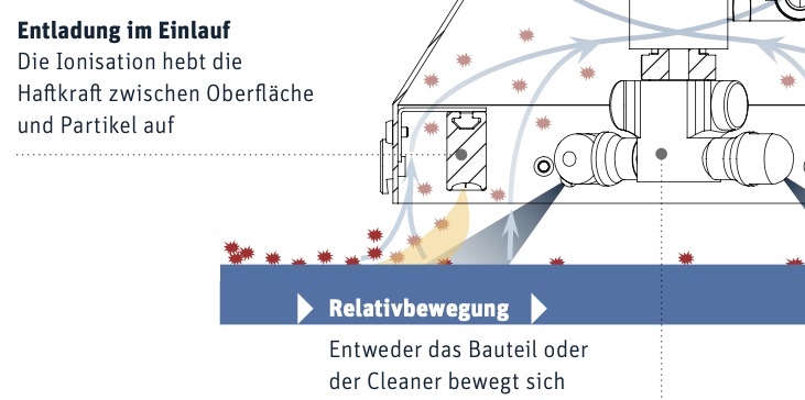 Statisch anhaftender Staub wird entladen und von einer rotierenden Düse mit zwei Luftauslässen abgeblasen. Durch die Rotation entsteht ein pulsierender Effekt. Der Düsendurchmesser und der Winkel der Luftstrahlen sind unabhängig voneinander einstellbar