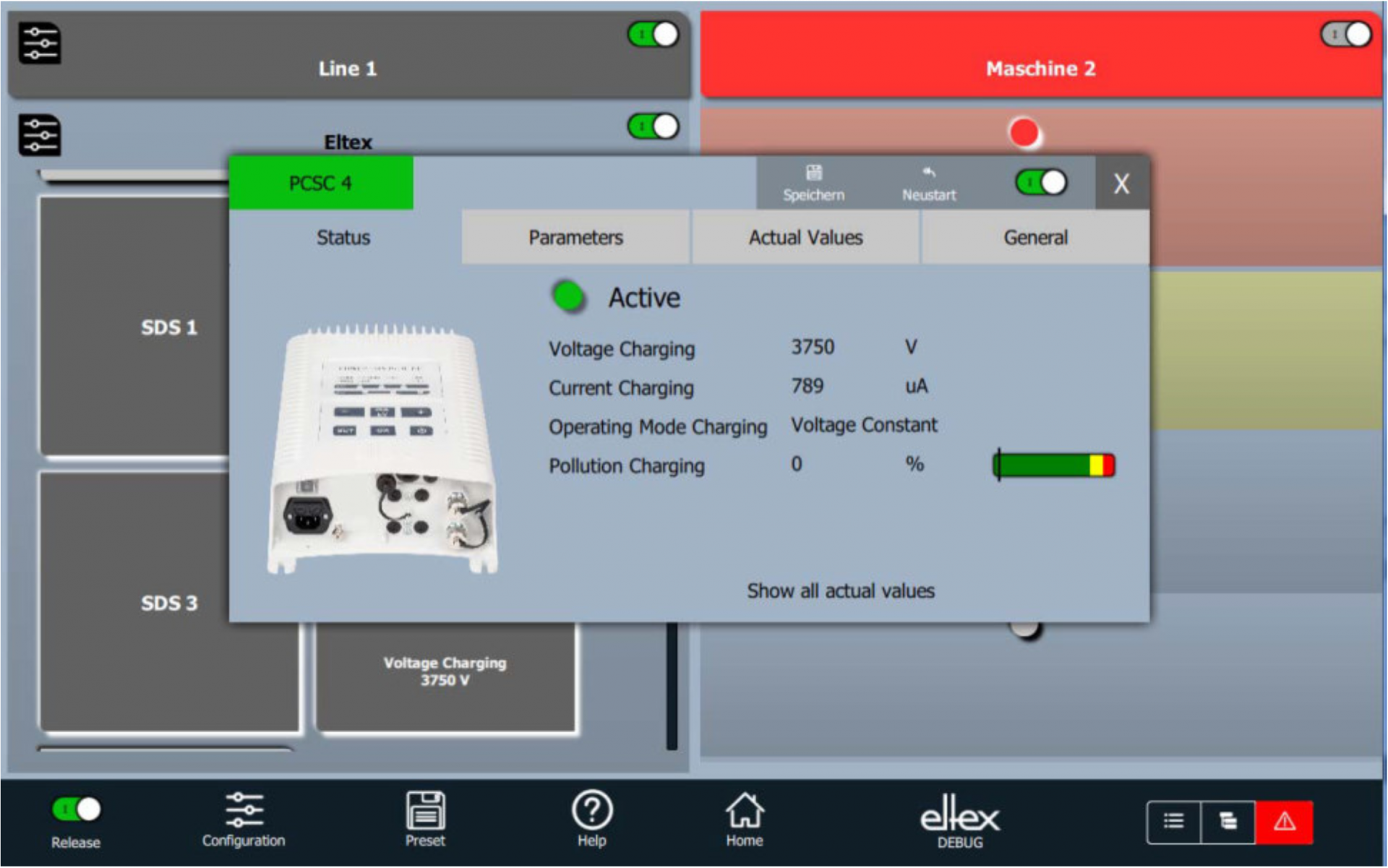 Die Visualisierung des Eltex Connected Control ist mit wenig Aufwand zu konfigurieren und bietet einen idealen Überblick über die angeschlossenen Systeme. Error-Log und Rezeptdatenbank erleichtern hierbei den Arbeitsalltag. Fehlerzustände und Wartungsbedarf werden direkt im Klartext angezeigt.Das Eltex ECC markiert damit den Sprung in die Digitalisierung der Ionisationssysteme und die Industrie4.0