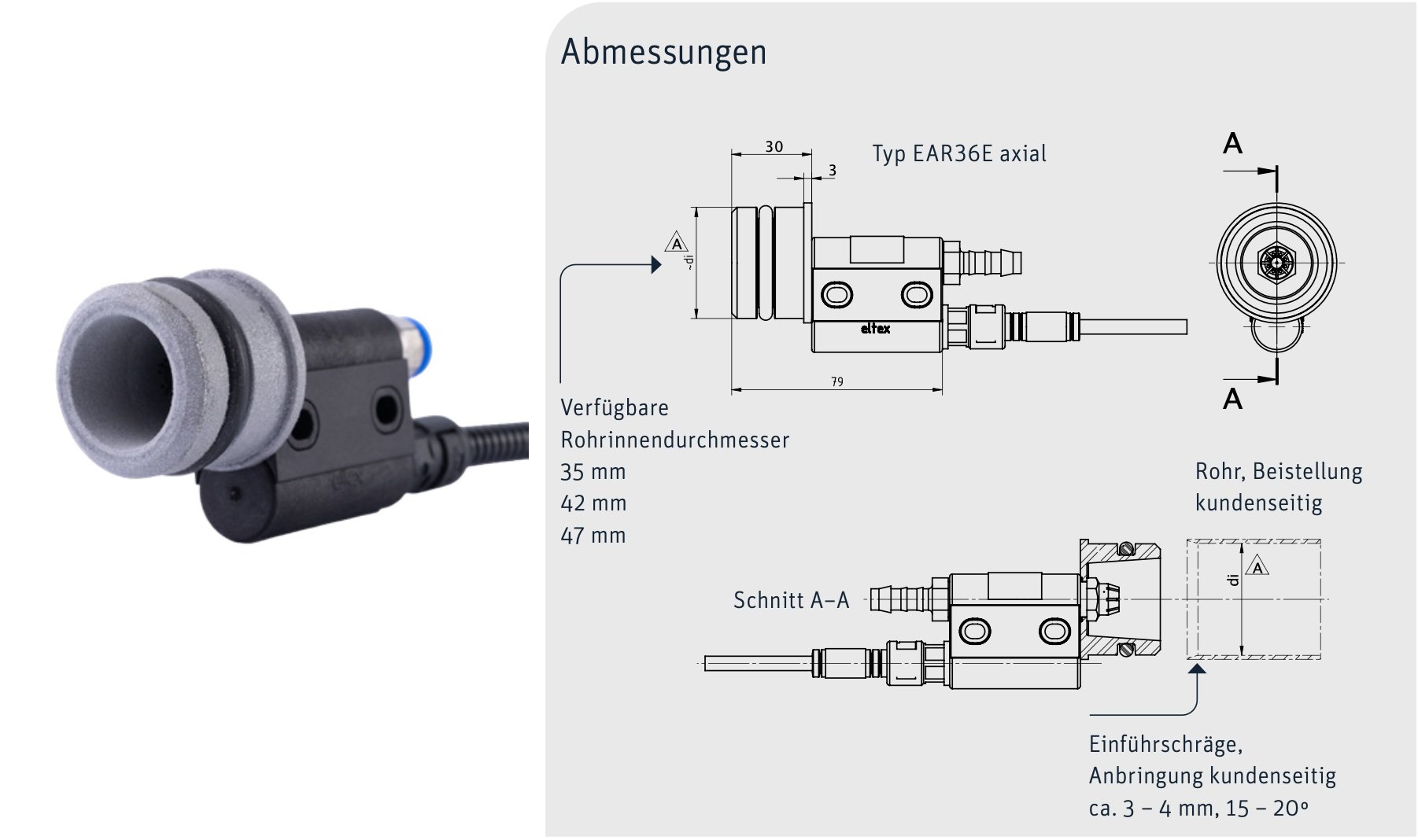 Um dieses Problem zu bewältigen, wurde der tubeBLOW EAR36E eingesetzt. Dieses innovative Gerät ermöglicht das Einblasen von Ionen in Rohrsysteme, um die elektrostatische Entladung zu kontrollieren und Materialanhaftungen zu verhindern. Der tubeBLOW EAR36E ist einfach nachrüstbar und kann mit verschiedenen Eltex-Entladekomponenten kombiniert werden, um eine gleichbleibende Entladeleistung sicherzustellen. Diese Lösung hat dazu beigetragen, die Produktionsprozesse unseres Kunden zu optimieren und die Produktqualität zu steigern.