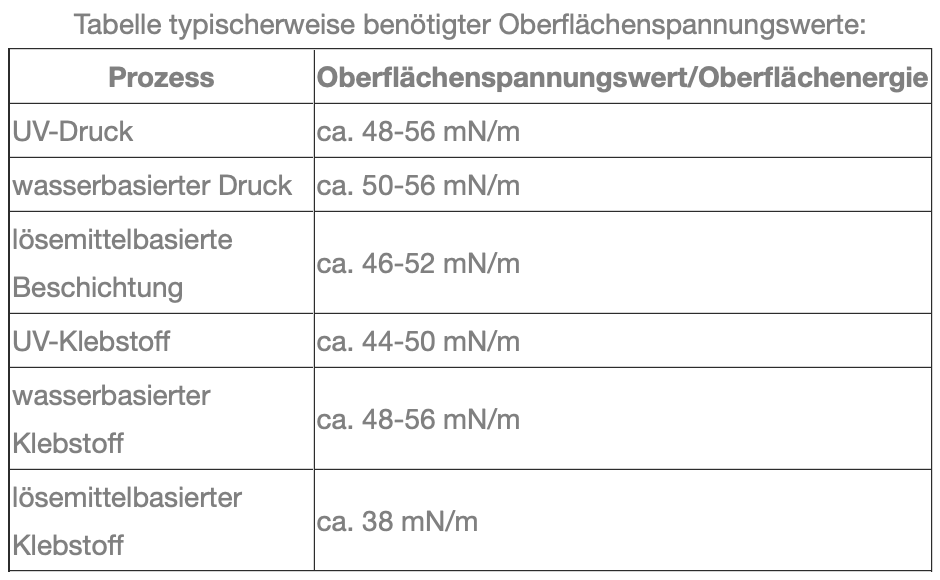 Nachfolgend finden Sie einige typische Oberflächenspannungswerte für verschiedene Kunststoffe und die benötigten Oberflächenspannung für den Weiterverarbeitungsprozess (Bedrucken, Beschichten oder Verkleben). Diese Werte beziehen sich auf die Oberfläche der Kunststoffe in "Reinform". Additive die an die Oberfläche migrieren und dort eine weitere Schicht darstellen verändern die Oberflächenenergie. Dazu gehören zum Beispiel Antistatika, Antiblock oder Gleitmittel. Aber auch Fingerabdrücke und Entformungshilfe können die Benetzung stören und sich auf die Oberflächenenergie auswirken.