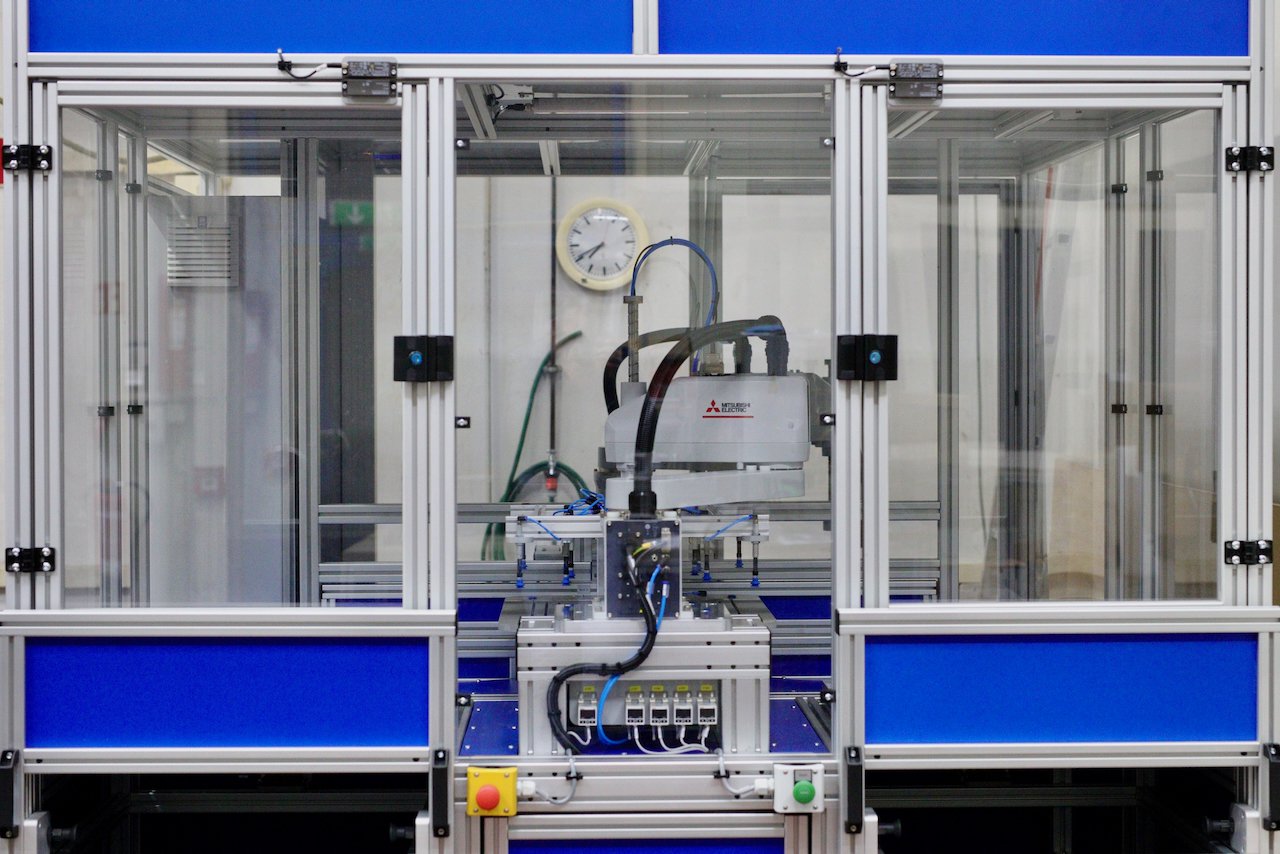Ein Mitsubishi SCARA-Roboter übernimmt das Handling der Dachbahn Abschnitt. Dabei hebt der Roboter die Dachbahn Abschnitt präzise von den Rollwagen ab und positioniert sie auf einem speziell entwickelten Vakuumtisch. Der Vakuumtisch sorgt dafür, dass die Abschnitte während des gesamten Prozesses sicher fixiert sind, ohne dass diese verrutschen.