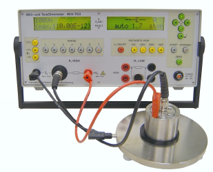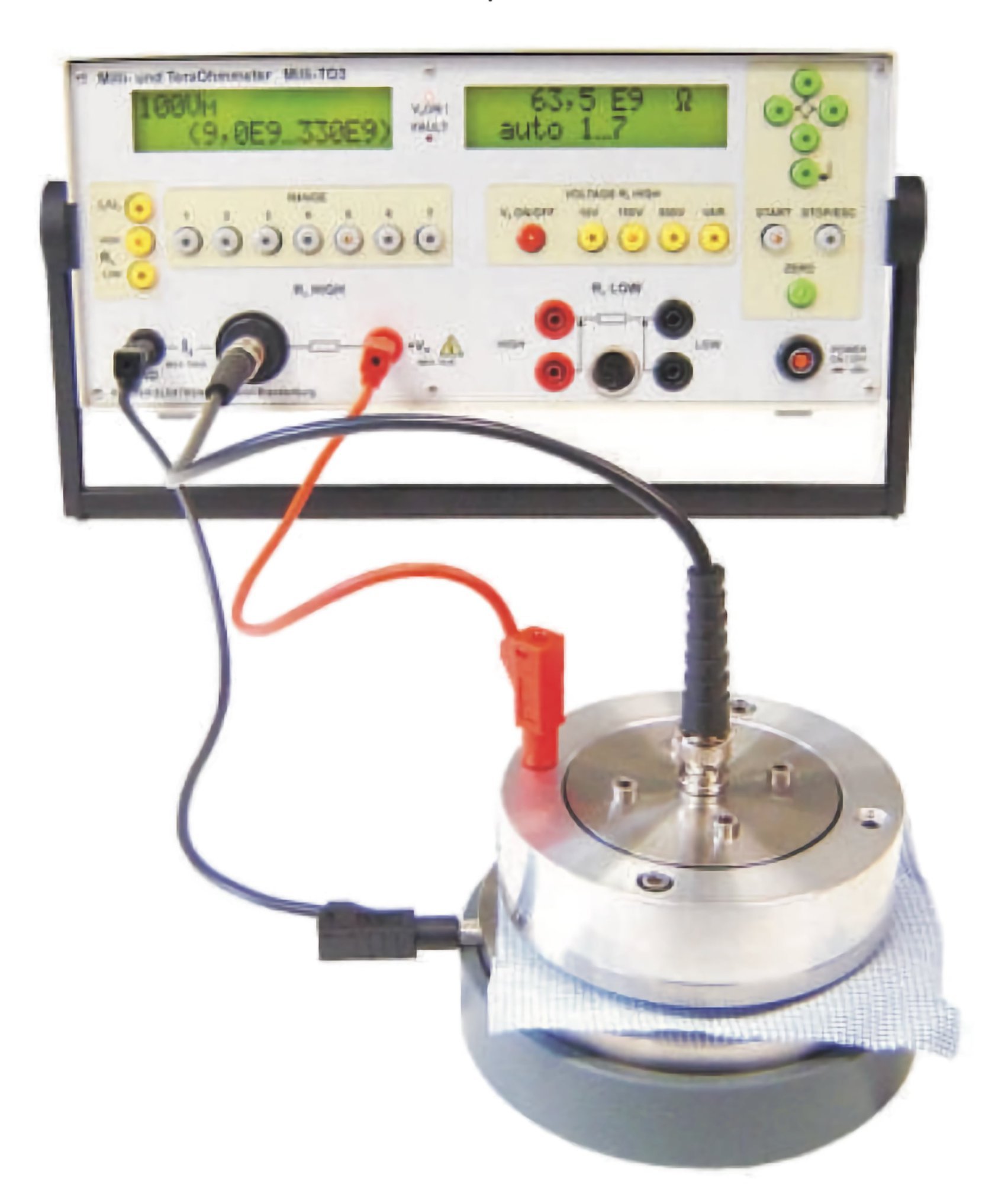Technische Daten: Innenelektrode Ø 25 mm, Schutzring Ø 40 mm außen. Max. 500 V, Messbereiche 10^3 bis 10^15 Ω.