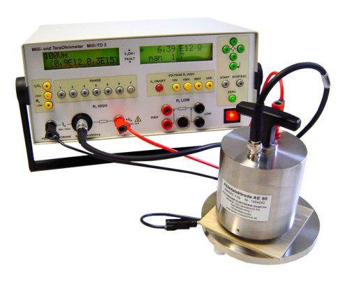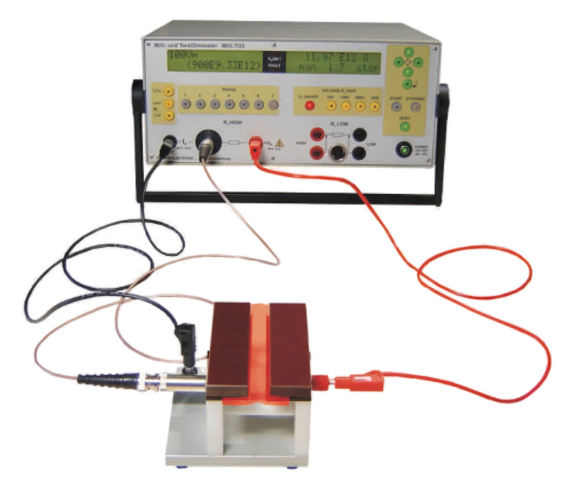 Technische Daten: Messlänge 50 mm, Messfläche 2,5 cm², 5 mm Messabstand. Messbereich 10^3 bis 10^15 Ω bei 100 V.