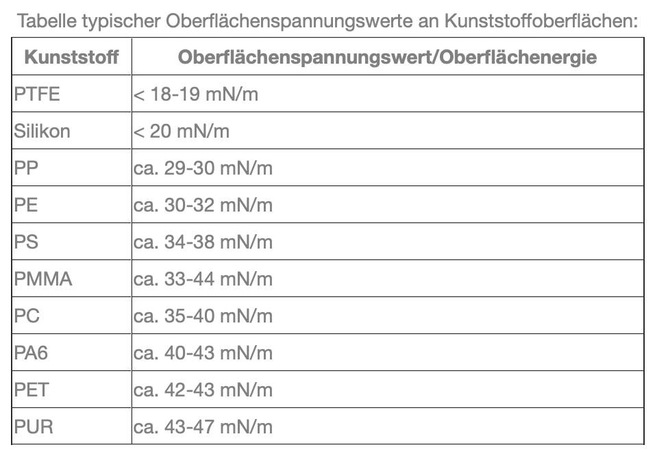 Nachfolgend finden Sie einige typische Oberflächenspannungswerte für verschiedene Kunststoffe und die benötigten Oberflächenspannung für den Weiterverarbeitungsprozess (Bedrucken, Beschichten oder Verkleben). Diese Werte beziehen sich auf die Oberfläche der Kunststoffe in "Reinform". Additive die an die Oberfläche migrieren und dort eine weitere Schicht darstellen verändern die Oberflächenenergie. Dazu gehören zum Beispiel Antistatika, Antiblock oder Gleitmittel. Aber auch Fingerabdrücke und Entformungshilfe können die Benetzung stören und sich auf die Oberflächenenergie auswirken.
