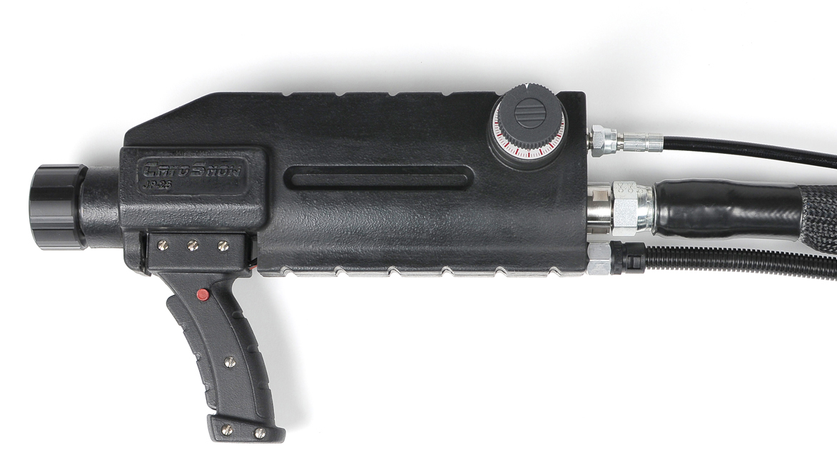Effizient und benutzerfreundlich: Die Strahlpistole ist das Herzstück des manuellen CO₂-Schneestrahlprozesses. Sie erzeugt präzise die CO₂-Schneepartikel und dosiert diese optimal in die Druckluftströmung. Dank ihrer thermischen Isolierung wird ein Kontakt mit kalten Oberflächen verhindert und Kondenswasserbildung vermieden, was eine komfortable und sichere Handhabung ermöglicht.