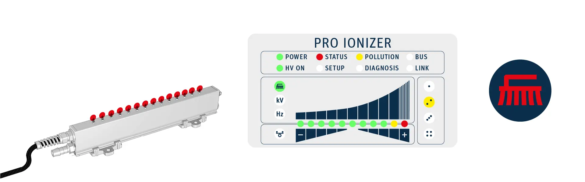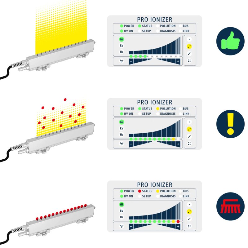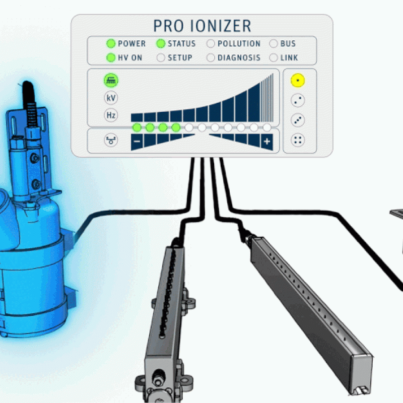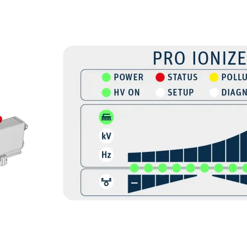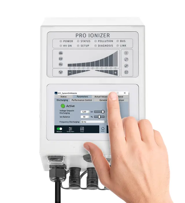 Maximale Elektrostatik-Kontrolle: Individuelle Einstellungen für Spannung, Frequenz und Ionenbalance garantieren optimale Ergebnisse in allen Produktionsumgebungen.