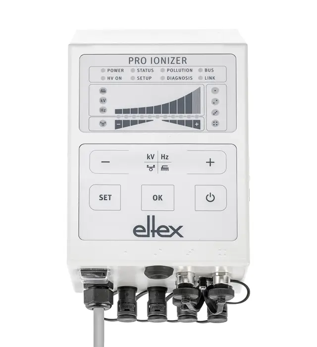 Um die Elektrostatik stets unter Kontrolle zu haben, bietet die intuitive Eltex-Steuerung die Möglichkeit, Prozessparameter wie Spannung, Frequenz und Ionenbalance individuell zu regulieren. Dies gewährleistet auch bei empfindlichen Prozessen eine stabile Ionenbalance.