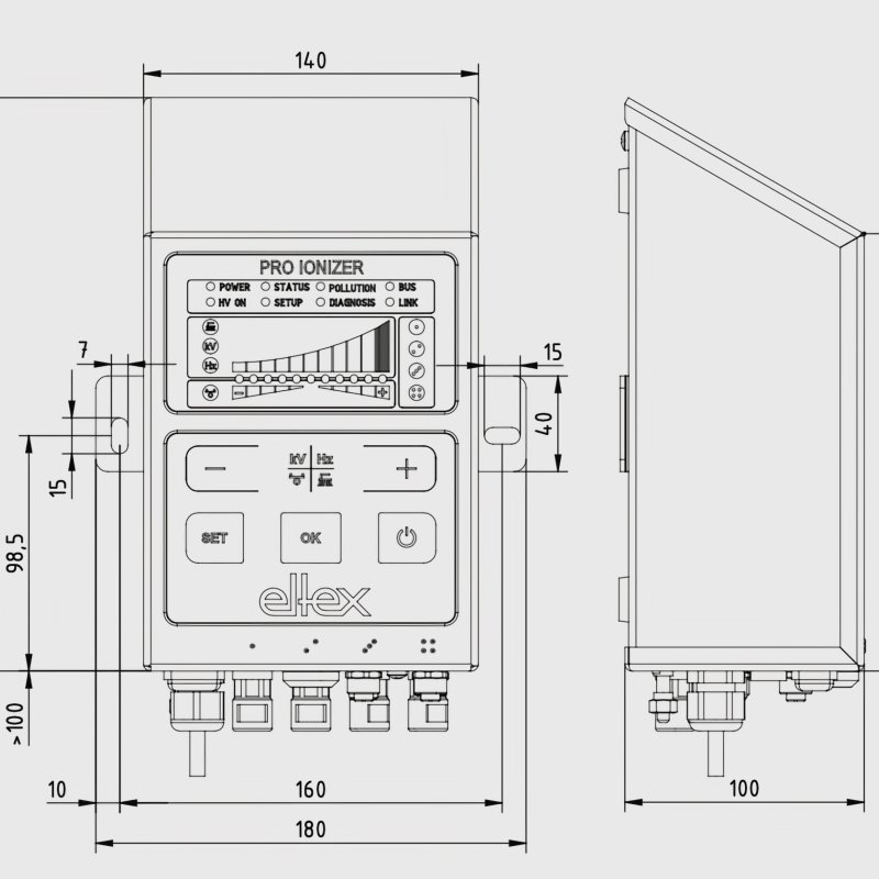 Ein weiteres Highlight des PRO IONIZER ES61 ist sein hoher Bedienkomfort. Benutzer können zwischen einer klassischen Folientastatur, einem Touch-Display und der Integration in externe Systeme über eine Feldbusschnittstelle wählen. Mit dem innovativen Visualisierungssystem Eltex Connected Control – kurz ECC – ist zudem eine komfortable digitale Verwaltung aller angeschlossenen Eltex-Entladeprodukte möglich, inklusive jener Produkte zur Aufladung oder Erdüberwachung.v