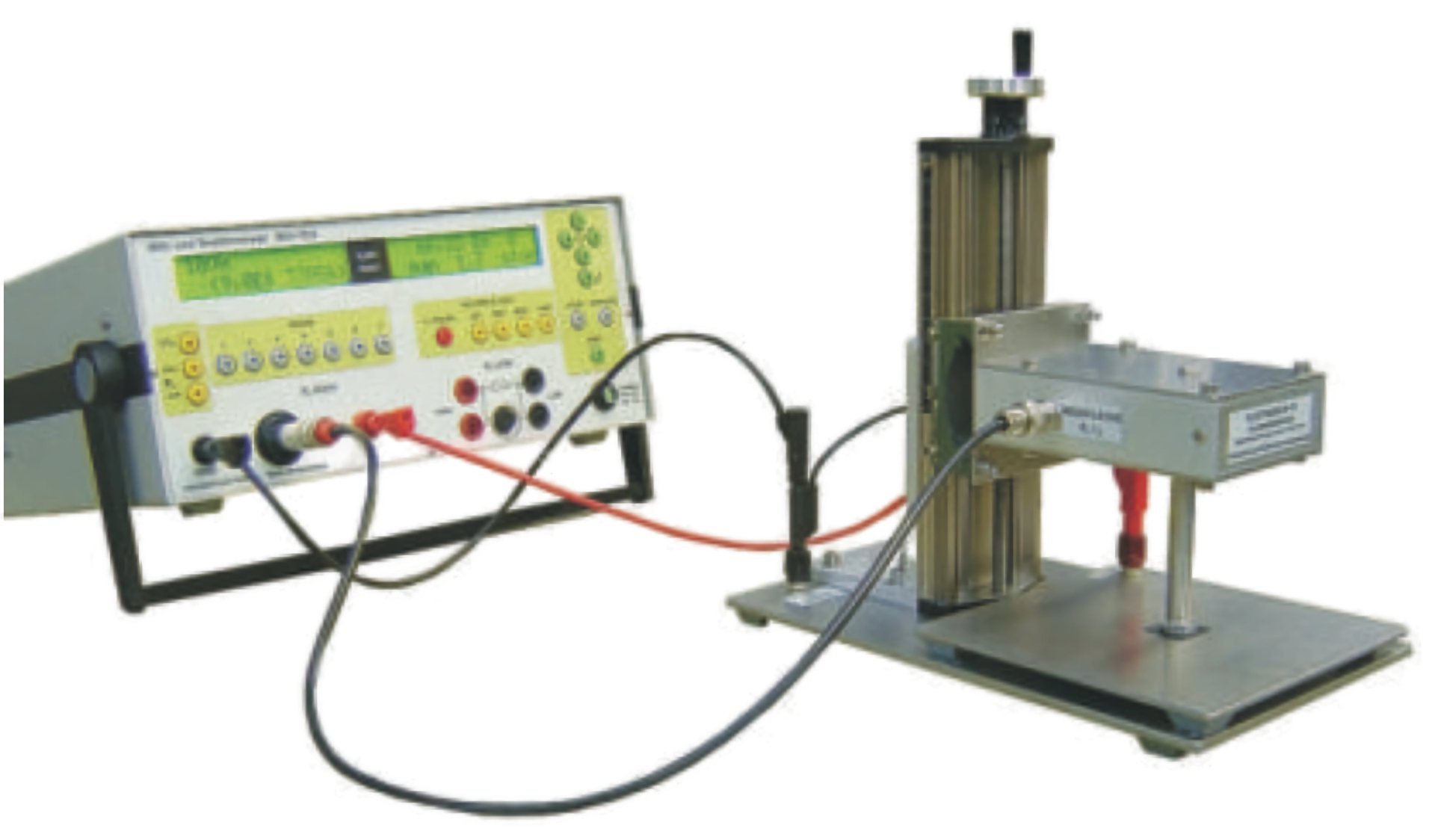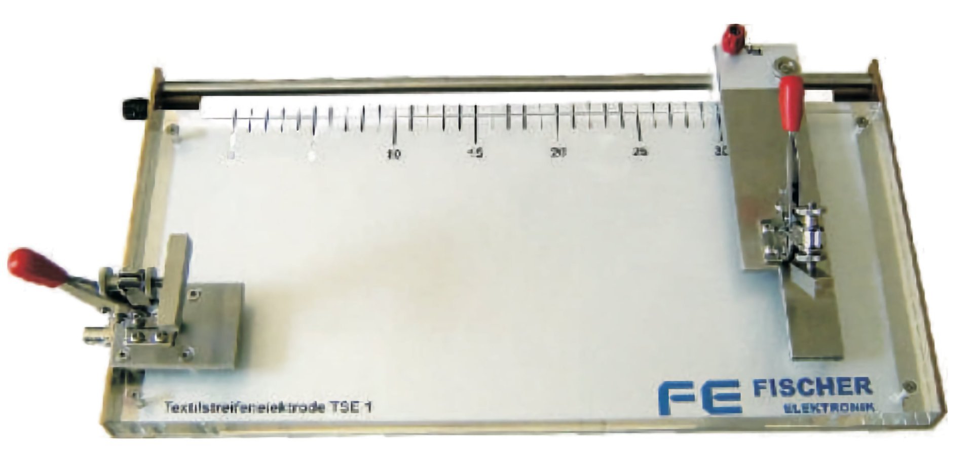 Zur Widerstandsmessung an Textilstreifen, mit variablen Elektrodenabständen.