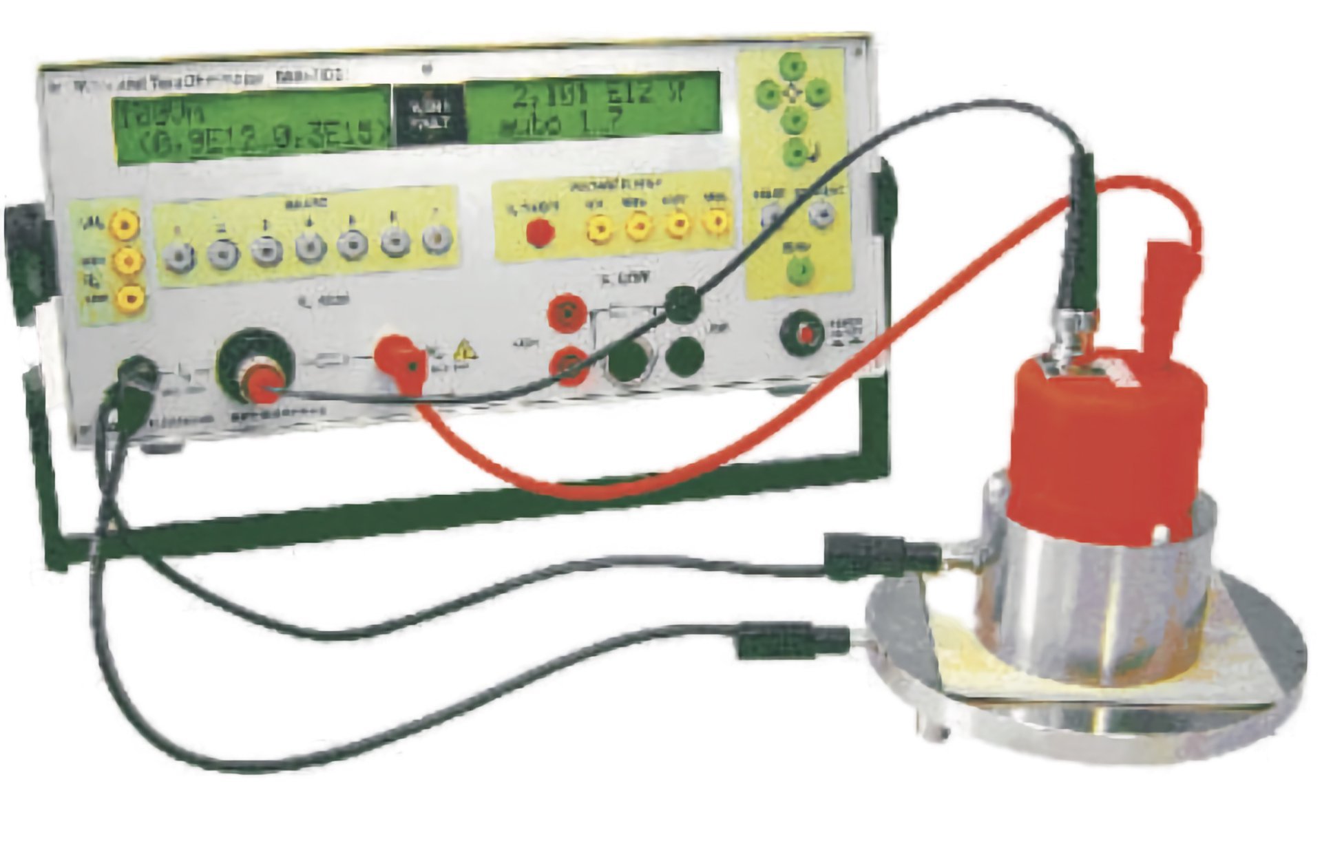 Technische Daten: Innenelektrode Ø 25 mm, Schutzring Ø 40 mm außen. Max. 500 V, Messbereiche 10^3 bis 10^15 Ω.